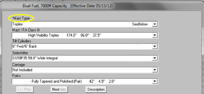 Any selections made in a category that is preceded by an asterisk WILL display and print in the proposal worksheet. This is to allow visual checking to determine that the correct focus for later selections has been made. Nothing will be printed in the proposal being prepared for the customer. If you have further questions regarding this or any other feature of our forklift quote software, please do not hesitate to contact us.
