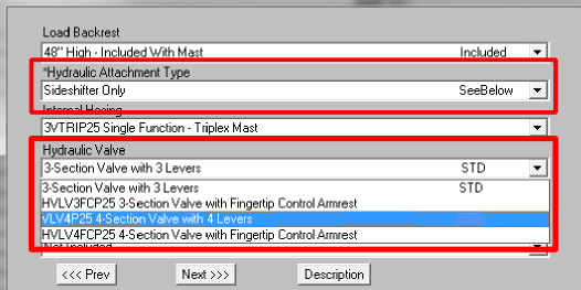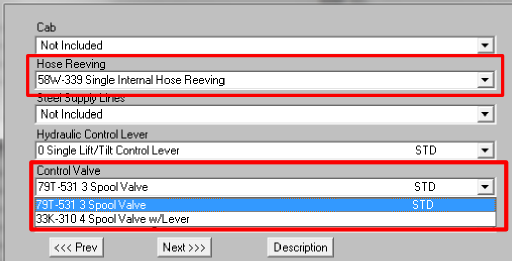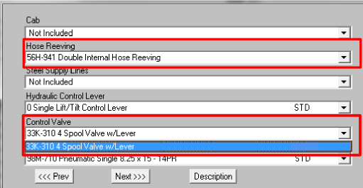 In the next example, a pneumatic tire, internal combustion 8000# capacity forklift is being quoted. Single internal hose reeving has been chosen and the configurator is offering two choices for the control valve as shown below (3 spool valve and 4 spool valve w/lever):