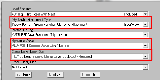 In the first example, a pneumatic tire, internal combustion, LPG, 5000# capacity lift truck is being quoted. A “Wide Integral Sideshifter” has been chosen in the configurator, and take note, that under “Hydraulic Attachment Type”, the option “Sideshifter Only” has been selected. When selecting these options, you can see that there are several “Hydraulic Valve” options available and there are no choices available for “Clamp Lever Lock-out.”