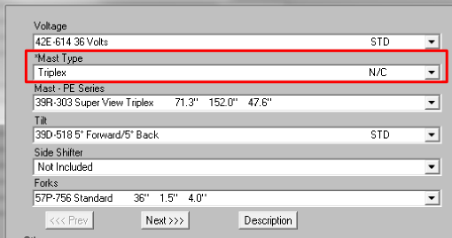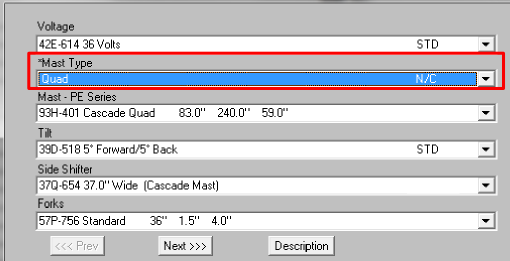 In the next example, a four wheel, electric, cushion tire, 5000# capacity forklift is being quoted. Notice that a triplex mast has been chosen. When the user clicks “Next”, SRA will move the configurator to the next group of options.