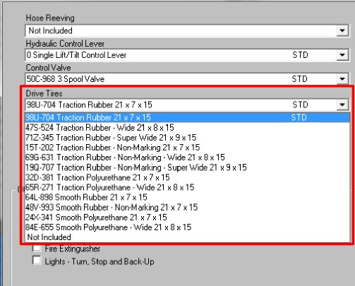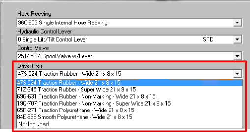 In the next frame of the equipment configurator, you see that several drive tire options are available.